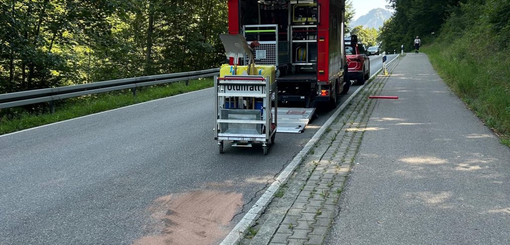 Auto mit Defekt und massiven Ölverlust an sog. „Hinanger Staig“ – Ölspur durch FF Altstädten abgebunden und Straße an zuständigen Straßenbaulastträger übergeben
